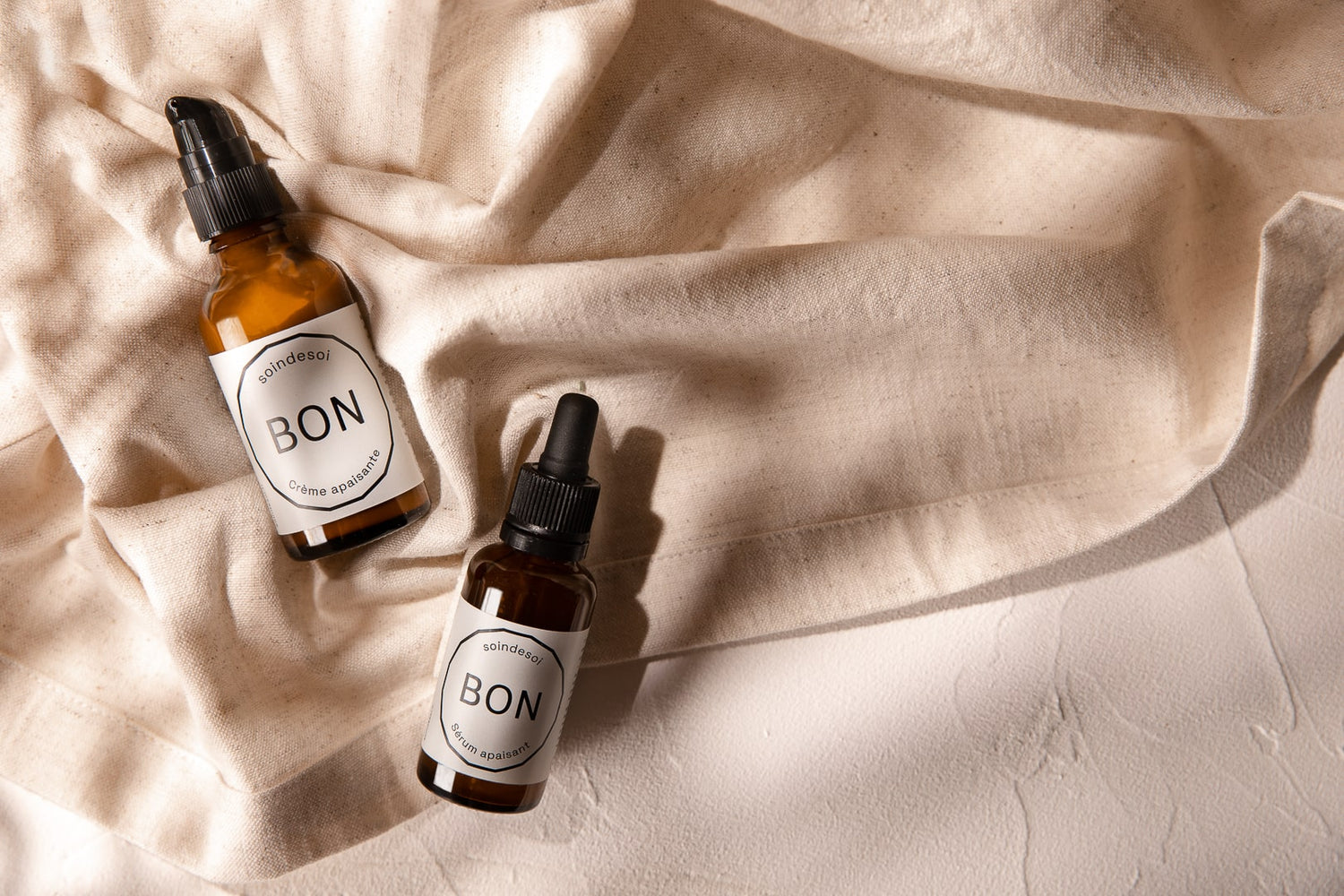 Moins mais mieux : privilégiez les produits aux compositions courtes et évitez les huiles essentielles qui peuvent irriter. Commencez par appliquer le sérum BON pour hydrater la peau tout en la repulpant et en l’apaisant. Appliquez ensuite la crème BON pour protéger la peau et la revitaliser. Le soir, appliquez votre huile de soin BON seule ou sous votre crème selon le confort souhaité. Elle nourrit la peau en profondeur, l’apaise et la répare.
