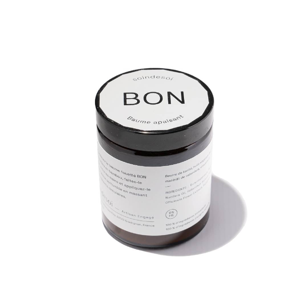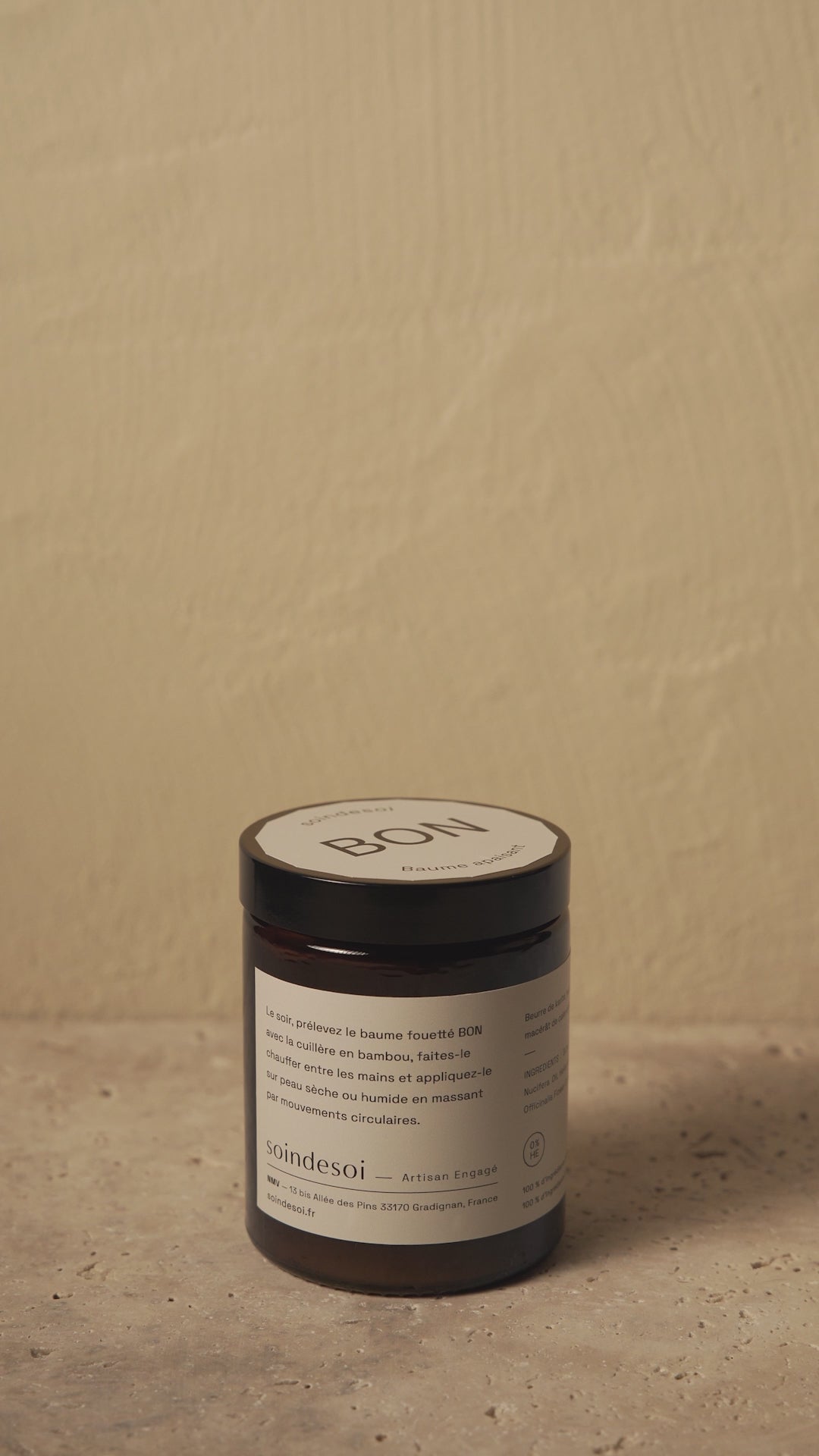 Le baume corps fouetté BON nourrit et apaise les peaux sensibles. Sa texture onctueuse et fondante protège et assouplit les peaux les plus sèches.