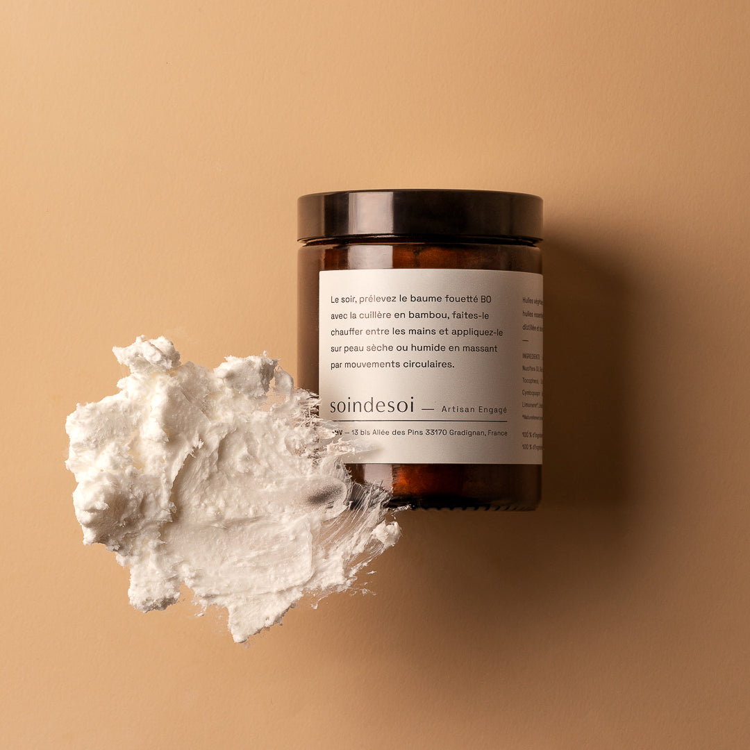 Le baume fouetté BO nourrit et apaise les peaux sèches. Sa texture onctueuse et fondante protège et assouplit la peau.